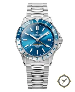 Eine GMT-Uhr mit einem 33.5mm Gehäuse im Vintage-Stil gefertigt aus Edelstahl mit einem Zifferblatt in blau und einer besonderen "sunburst"-Oberfläche und einer echten GMT-Funktion, mit der du eine zweite Zeitzone verfolgen kannst.