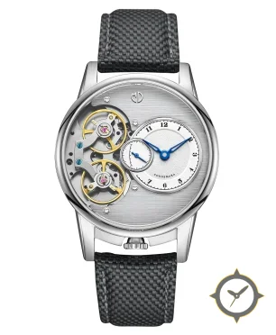Eine Skelett-Uhr mit einem markanten 45.5mm Auftritt am Handgelenk, gefertigt aus Edelstahl mit einem Zifferblatt in silber und einer besonderen "horizontal brushed"-Oberfläche.