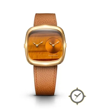 Eine Dress-Uhr mit einem 32.5mm Gehäuse im Vintage-Stil gefertigt aus Gold mit einem Zifferblatt in braun und einer besonderen "tiger's-eye stone / wood-grain finish"-Oberfläche.