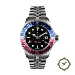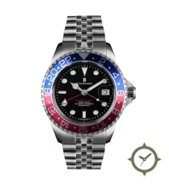 Eine GMT-Uhr mit einem markanten 47.5mm Auftritt am Handgelenk, gefertigt aus Edelstahl mit einem Zifferblatt in schwarz und einer besonderen "matte"-Oberfläche und einer echten GMT-Funktion, mit der du eine zweite Zeitzone verfolgen kannst.