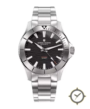 Eine Taucheruhr-Uhr mit einem 33mm Gehäuse im Vintage-Stil gefertigt aus Edelstahl mit einem Zifferblatt in schwarz und einer besonderen "wave texture"-Oberfläche.