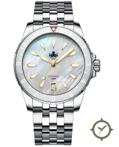 Eine Taucheruhr-Uhr mit einem 34mm Gehäuse im Vintage-Stil gefertigt aus Edelstahl mit einem Zifferblatt in weiß und einer besonderen "mother-of-pearl"-Oberfläche.