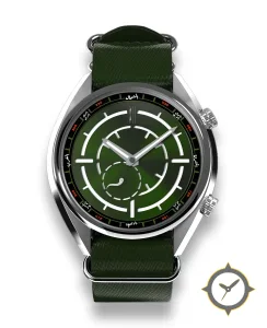 Eine Militär-Uhr gefertigt aus Edelstahl mit einem Zifferblatt in grün und einer besonderen "sunburst/gradient"-Oberfläche.