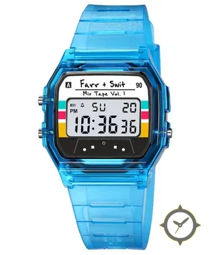 Eine Digital-Uhr mit einem 36mm Gehäuse im Vintage-Stil gefertigt aus Harz mit einem Zifferblatt in weiß und einer besonderen "smooth plastic digital display"-Oberfläche.