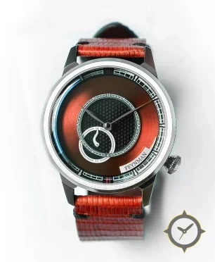 Eine Dress-Uhr mit einem 31.5mm Gehäuse im Vintage-Stil gefertigt aus Edelstahl mit einem Zifferblatt in braun und einer besonderen "radial sunburst with guilloché (textured) center"-Oberfläche.