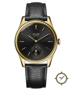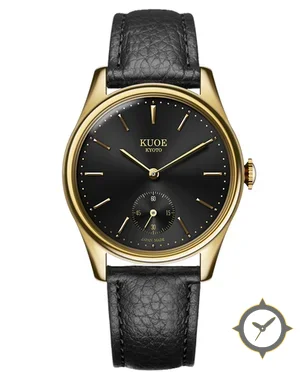 Eine Dress-Uhr mit einem 34mm Gehäuse im Vintage-Stil gefertigt aus Gold mit einem Zifferblatt in schwarz und einer besonderen "sunburst"-Oberfläche.