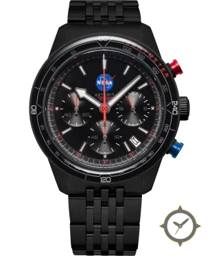 Eine Chronograph-Uhr mit einem markanten 43.5mm Auftritt am Handgelenk, gefertigt aus Edelstahl mit einem Zifferblatt in schwarz und einer besonderen "matte black with subtle radial sunburst"-Oberfläche.