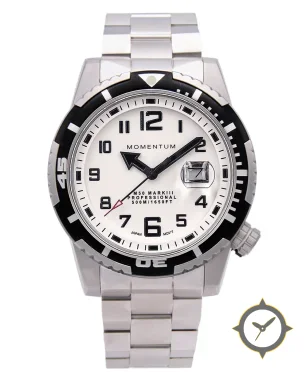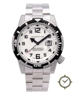 Eine Taucheruhr-Uhr mit einem markanten 41.5mm Auftritt am Handgelenk, gefertigt aus Edelstahl mit einem Zifferblatt in weiß und einer besonderen "matte lacquer"-Oberfläche und einer echten GMT-Funktion, mit der du eine zweite Zeitzone verfolgen kannst.