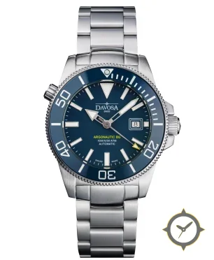 Eine Taucheruhr-Uhr mit einem markanten 46.5mm Auftritt am Handgelenk, gefertigt aus Edelstahl mit einem Zifferblatt in blau und einer besonderen "sunburst"-Oberfläche.