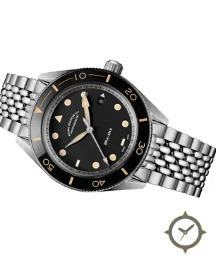 Eine Taucheruhr-Uhr mit einem vielseitigen 40mm Gehäuse, das an fast jedes Handgelenk passt, gefertigt aus Edelstahl mit einem Zifferblatt in schwarz und einer besonderen "matte"-Oberfläche.
