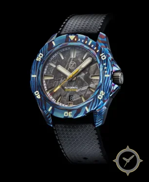 Eine Taucheruhr-Uhr mit einem markanten 41.5mm Auftritt am Handgelenk, gefertigt aus Titan mit einem Zifferblatt in grau und einer besonderen "textured, meteorite-style finish"-Oberfläche.
