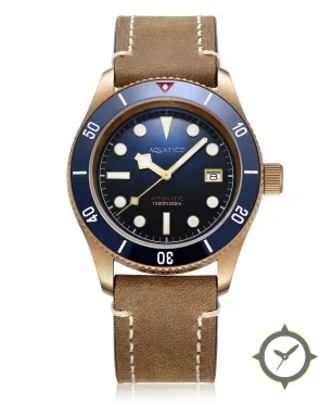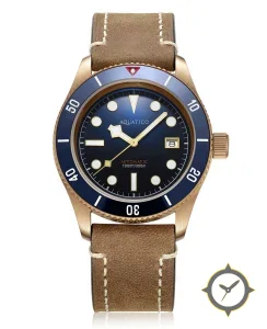 Eine Taucheruhr-Uhr mit einem 35.5mm Gehäuse im Vintage-Stil gefertigt aus Bronze mit einem Zifferblatt in marineblau und einer besonderen "radial sunburst"-Oberfläche.