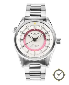 Eine GMT-Uhr mit einem vielseitigen 38mm Gehäuse, das an fast jedes Handgelenk passt, gefertigt aus Edelstahl mit einem Zifferblatt in weiß und einer besonderen "matte center with colored 24-hour ring"-Oberfläche und einer echten GMT-Funktion, mit der du eine zweite Zeitzone verfolgen kannst.