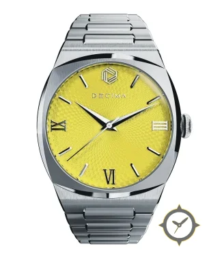 Eine Luxus-Uhr mit einem 35mm Gehäuse im Vintage-Stil gefertigt aus Edelstahl mit einem Zifferblatt in gelb und einer besonderen "guilloché (radial wave)"-Oberfläche.