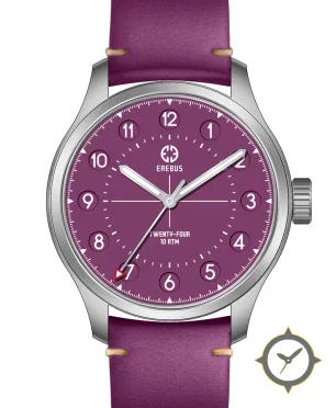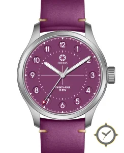 Eine Field-Uhr mit einem vielseitigen 39.5mm Gehäuse, das an fast jedes Handgelenk passt, gefertigt aus Edelstahl mit einem Zifferblatt in lila und einer besonderen "matte"-Oberfläche.