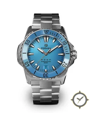Eine Taucheruhr-Uhr mit einem 33.5mm Gehäuse im Vintage-Stil gefertigt aus Edelstahl mit einem Zifferblatt in türkis und einer besonderen "sunburst"-Oberfläche.