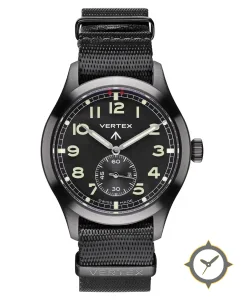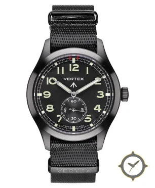 Eine Militär-Uhr mit einem vielseitigen 40mm Gehäuse, das an fast jedes Handgelenk passt, gefertigt aus Edelstahl mit einem Zifferblatt in schwarz und einer besonderen "matte"-Oberfläche.