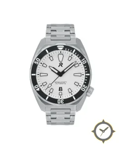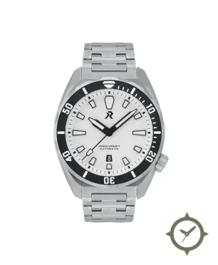 Eine Taucheruhr-Uhr mit einem markanten 50mm Auftritt am Handgelenk, gefertigt aus Edelstahl mit einem Zifferblatt in weiß und einer besonderen "matte"-Oberfläche.