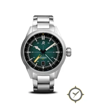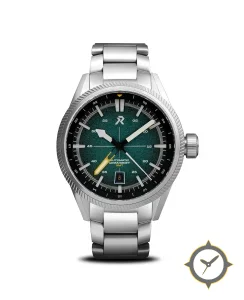 Eine GMT-Uhr mit einem 33mm Gehäuse im Vintage-Stil gefertigt aus Edelstahl mit einem Zifferblatt in grün und einer besonderen "textured/grained finish with slight gradient"-Oberfläche und einer echten GMT-Funktion, mit der du eine zweite Zeitzone verfolgen kannst.