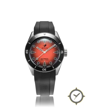 Eine Taucheruhr-Uhr mit einem 34.5mm Gehäuse im Vintage-Stil gefertigt aus Edelstahl mit einem Zifferblatt in orange und einer besonderen "sunburst gradient / fumé"-Oberfläche.