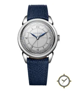 Eine Dress-Uhr mit einem markanten 43.5mm Auftritt am Handgelenk, gefertigt aus Edelstahl mit einem Zifferblatt in silber und einer besonderen "matte with subtle sector finishing"-Oberfläche.