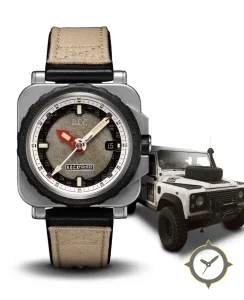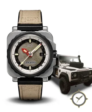 Eine Taktisch-Uhr mit einem 35.5mm Gehäuse im Vintage-Stil gefertigt aus Edelstahl mit einem Zifferblatt in grau und einer besonderen "textured/stone-like, distressed finish"-Oberfläche.
