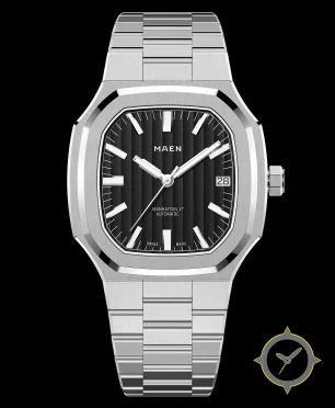 Eine Luxus-Uhr mit einem 37.5mm Gehäuse im Vintage-Stil gefertigt aus Edelstahl mit einem Zifferblatt in schwarz und einer besonderen "vertical striped / ribbed"-Oberfläche.