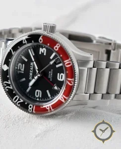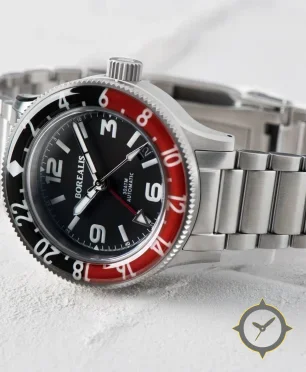 Eine GMT-Uhr mit einem vielseitigen 38.5mm Gehäuse, das an fast jedes Handgelenk passt, gefertigt aus Edelstahl mit einem Zifferblatt in schwarz und einer besonderen "matte"-Oberfläche und einer echten GMT-Funktion, mit der du eine zweite Zeitzone verfolgen kannst.