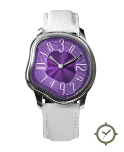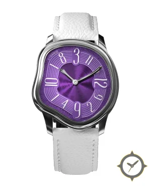 Eine Dress-Uhr mit einem 8mm Gehäuse im Vintage-Stil gefertigt aus Edelstahl mit einem Zifferblatt in lila und einer besonderen "sunburst guilloche"-Oberfläche.