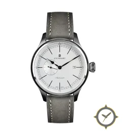 Eine Dress-Uhr mit einem markanten 50mm Auftritt am Handgelenk, gefertigt aus Edelstahl mit einem Zifferblatt in weiß und einer besonderen "matte opaline"-Oberfläche.