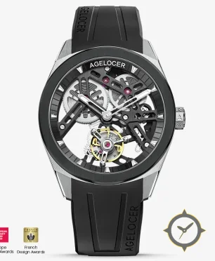 Eine Skelett-Uhr mit einem markanten 44mm Auftritt am Handgelenk, gefertigt aus Edelstahl mit einem Zifferblatt in schwarz und einer besonderen "open-worked / skeleton"-Oberfläche.
