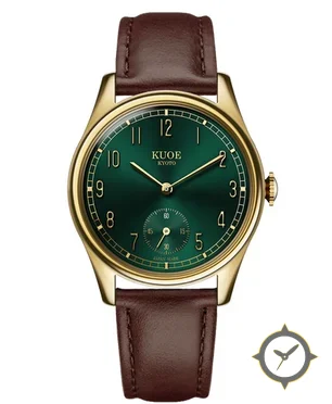 Eine Dress-Uhr mit einem 31mm Gehäuse im Vintage-Stil gefertigt aus Gold mit einem Zifferblatt in grün und einer besonderen "sunburst (radial gradient)"-Oberfläche.