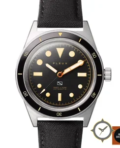 Eine Taucheruhr-Uhr mit einem 34.5mm Gehäuse im Vintage-Stil gefertigt aus Edelstahl mit einem Zifferblatt in schwarz und einer besonderen "matte"-Oberfläche.