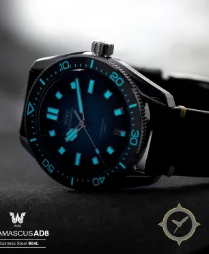 Eine Taucheruhr-Uhr mit einem 36mm Gehäuse im Vintage-Stil gefertigt aus Edelstahl mit einem Zifferblatt in blau und einer besonderen "wavy"-Oberfläche.