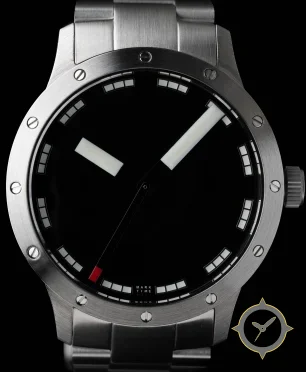 Eine Minimalistisch-Uhr mit einem markanten 41.5mm Auftritt am Handgelenk, gefertigt aus Edelstahl mit einem Zifferblatt in schwarz und einer besonderen "glossy"-Oberfläche.