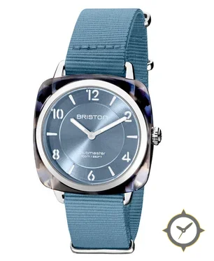 Eine Vintage-Uhr mit einem 32mm Gehäuse im Vintage-Stil gefertigt aus Harz mit einem Zifferblatt in blau und einer besonderen "sunburst"-Oberfläche.
