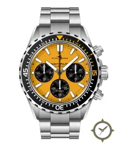 Eine Taucheruhr-Uhr mit einem vielseitigen 39.5mm Gehäuse, das an fast jedes Handgelenk passt, gefertigt aus Edelstahl mit einem Zifferblatt in orange und einer besonderen "matte"-Oberfläche.