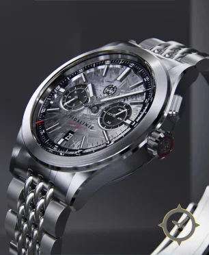 Eine Chronograph-Uhr mit einem vielseitigen 39mm Gehäuse, das an fast jedes Handgelenk passt, gefertigt aus Edelstahl mit einem Zifferblatt in grau und einer besonderen "textured meteorite-like metallic finish"-Oberfläche.