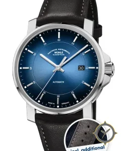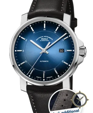 Eine Dress-Uhr mit einem 35mm Gehäuse im Vintage-Stil gefertigt aus Edelstahl mit einem Zifferblatt in blau und einer besonderen "sunburst"-Oberfläche.