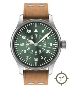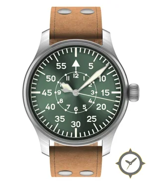 Eine Pilot-Uhr mit einem 34mm Gehäuse im Vintage-Stil gefertigt aus Edelstahl mit einem Zifferblatt in grün und einer besonderen "sunburst"-Oberfläche.