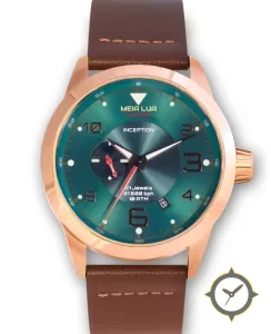 Eine Fahrer-Uhr mit einem vielseitigen 41mm Gehäuse, das an fast jedes Handgelenk passt, gefertigt aus Gold mit einem Zifferblatt in grün und einer besonderen "sunburst"-Oberfläche.