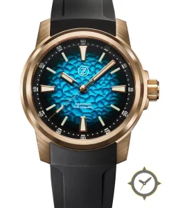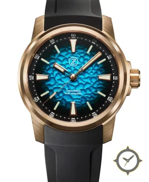 Eine Taucheruhr-Uhr mit einem 37.5mm Gehäuse im Vintage-Stil gefertigt aus Bronze mit einem Zifferblatt in türkis und einer besonderen "pebble/hammered textured (mottled, 3D relief)"-Oberfläche.