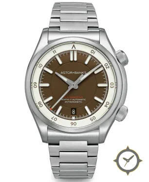 Eine Taucheruhr-Uhr mit einem vielseitigen 40mm Gehäuse, das an fast jedes Handgelenk passt, gefertigt aus Edelstahl mit einem Zifferblatt in braun und einer besonderen "matte"-Oberfläche.