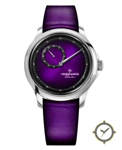 Eine -Uhr mit einem 35.5mm Gehäuse im Vintage-Stil gefertigt aus Edelstahl mit einem Zifferblatt in lila und einer besonderen "sunburst"-Oberfläche.