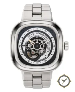 Eine Skelett-Uhr mit einem markanten 47mm Auftritt am Handgelenk, gefertigt aus Edelstahl mit einem Zifferblatt in schwarz und einer besonderen "multi-layer open-heart / partially skeletonized"-Oberfläche.