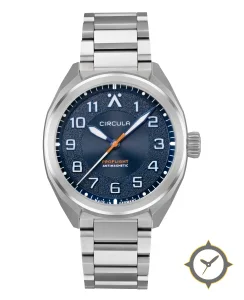 Eine Luftfahrt-Uhr mit einem 35mm Gehäuse im Vintage-Stil gefertigt aus Edelstahl mit einem Zifferblatt in blau und einer besonderen "textured/grained outer surface with concentric circular guilloché at center"-Oberfläche.