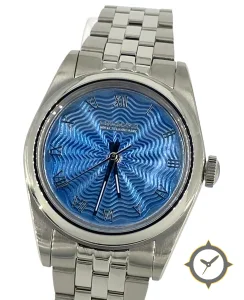 Eine Dress-Uhr mit einem 37.5mm Gehäuse im Vintage-Stil gefertigt aus Edelstahl mit einem Zifferblatt in blau und einer besonderen "wavy guilloché (engine-turned)"-Oberfläche.