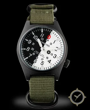 Eine Field-Uhr mit einem 34.5mm Gehäuse im Vintage-Stil gefertigt aus Edelstahl mit einem Zifferblatt in schwarz und einer besonderen "matte"-Oberfläche.