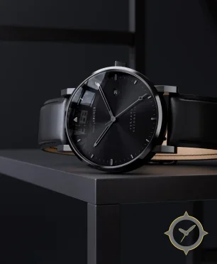 Eine Dress-Uhr mit einem 32.5mm Gehäuse im Vintage-Stil gefertigt aus Edelstahl mit einem Zifferblatt in schwarz und einer besonderen "sunburst"-Oberfläche.