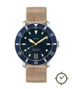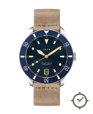 Eine Taucheruhr-Uhr mit einem 35.5mm Gehäuse im Vintage-Stil gefertigt aus Edelstahl mit einem Zifferblatt in marineblau und einer besonderen "sunburst"-Oberfläche.